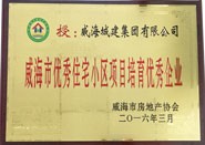獲獎名稱:威海市優(yōu)秀住宅小區(qū)項目培育優(yōu)秀企業(yè) 獲獎單位:威海城建集團有限公司 授獎單位:威海市房地產(chǎn)協(xié)會